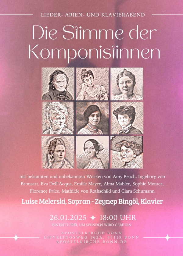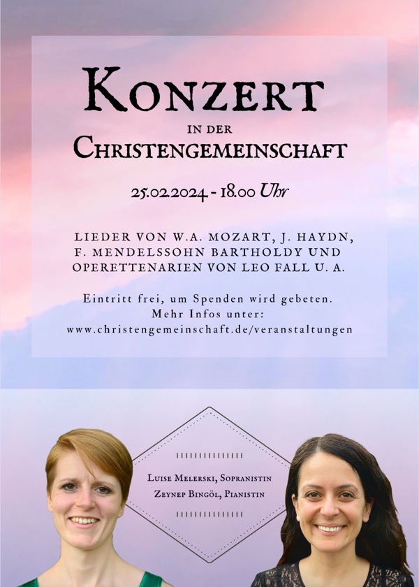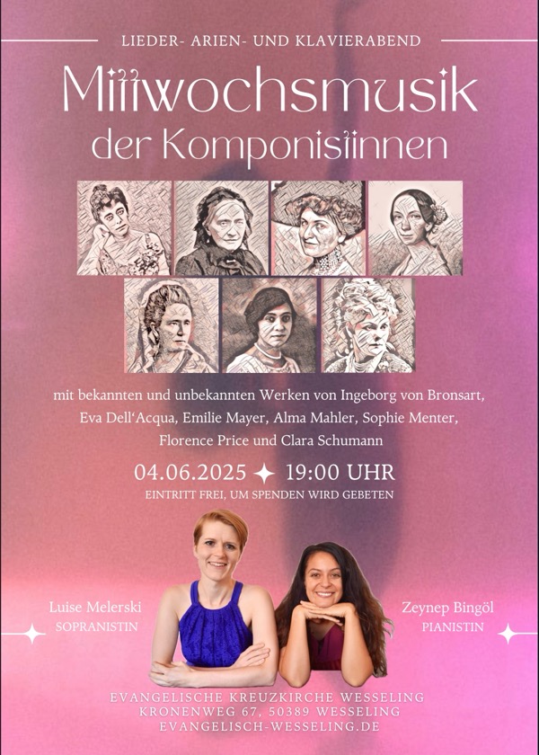 Informationen, wo und wann das nächste öffentliche Konzert von mir oder vom Duo Luise Melerski – Zeynep Bingöl stattfindet, können hier aufgerufen werden. Falls Du ganz sicher gehen möchtest, kannst Du mich auch gerne kontaktieren und den Newsletter anfordern.